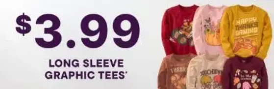 Hurry in and save! Shop in store and get $3.99 on long sleeve graphic tees.