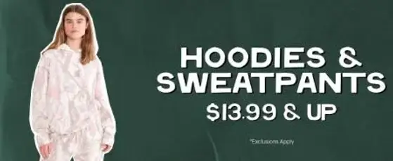 Limited time only! Shop in store and get $13.99 & up on hoodies & sweatpants.