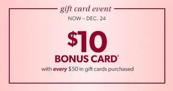 Spend $50 on gifts cards, get a $10 bonus card. Offer valid in any maurices store until December 24, 2025. No coupon needed in stores. Offer will not be re-issued if lost, stolen or destroyed or with return/refund of merchandise. $10 bonus coupon redeemable in stores and online toward a purchase December 26, 2025 through January 15, 2026.
