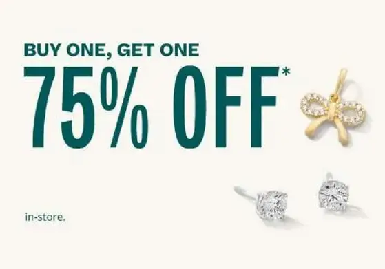 *Buy One, Get One 75% Off valid in stores from December 3, 2025 7:00 AM ET through December 8, 2025 6:59 AM ET. Second item purchased must be of equal or lesser value than the original item. Sale excludes piercing earrings, personalized jewelry, special offers, gift cards, prior purchases, extended service agreements, charitable Items and donations and needle piercing fees. Cannot be combined with any other offer. Offer may exclude certain items. Promotions, pricing, styles and availability may vary by store. Please see Jewelry expert for details.